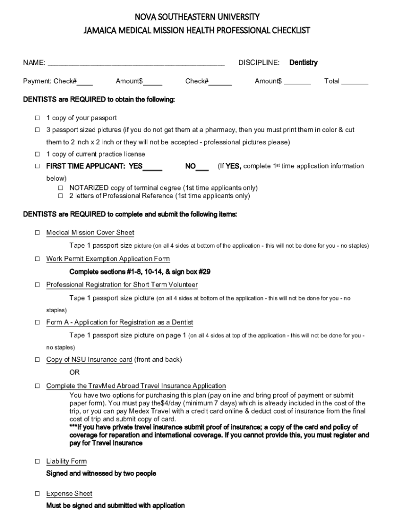 NOVA SOUTHEASTERN UNIVERSITY JAMAICA MEDICAL MISSION HEALTH PROFESSIONAL CHECKLIST NAME: ___ Payment: Check#Amount$Check#DISCIPLINE:DentistryAmount$ ___Total ___DENTISTS are REQUIRED to obtain the