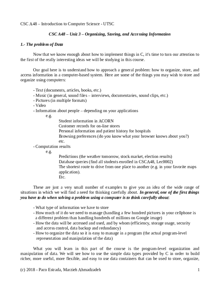 CSC A48 Introduction to Computer Science UTC CSC A48 Unit 3 Organizing, Storing, and Accessing Information 1. The problem of Data Now that we know enough about how to implement things in C, it\'s