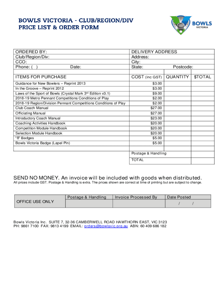 ORDERED BY: Club/Region/Div: CCO: Phone: ()DELIVERY ADDRESS: City: State: Postcode:Date:ITEMS FOR PURCHASES (inc GST) QUANTITYGuidance for New Bowlers Reprint 2013 In the Groove Reprint 2012 Laws