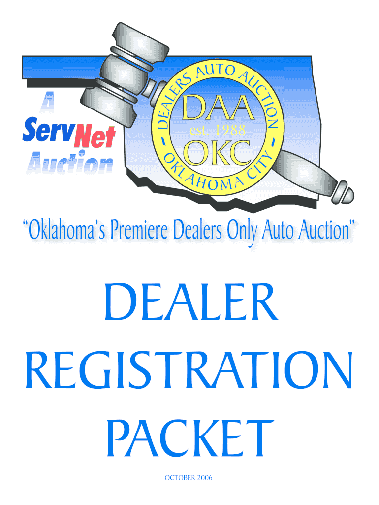 Servlet Oklahoma's Premiere Dealers Only Auto Auction DEALER REGISTRATION PACKET OCTOBER 2006 DEALER IS OF AUTO OK, AUCTION I NC. By registering with Dealers Auto Auction of OK, Inc. (DANK), I agree