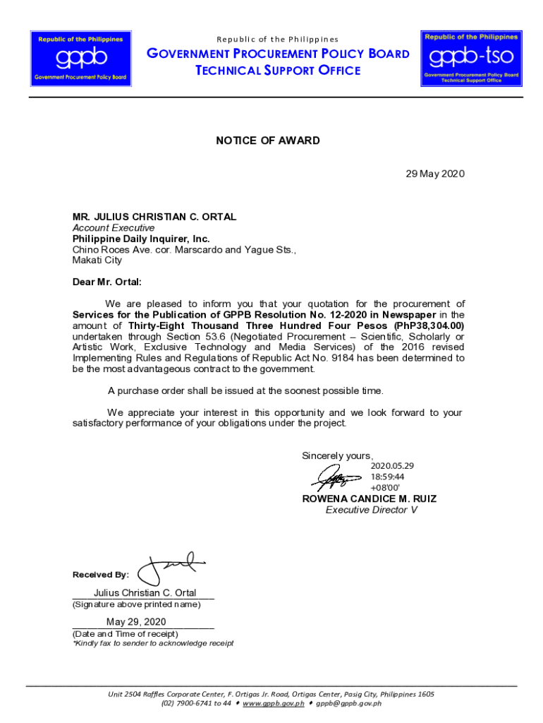 Re p u b l IC of the Phil IP p i n BS GOVERNMENT PROCUREMENT POLICY BOARD TECHNICAL SUPPORT OFFICENOTICE OF AWARD 29 May 2020MR. JULIUS CHRISTIAN C. ORAL Account Executive Philippine Daily Inquirer,