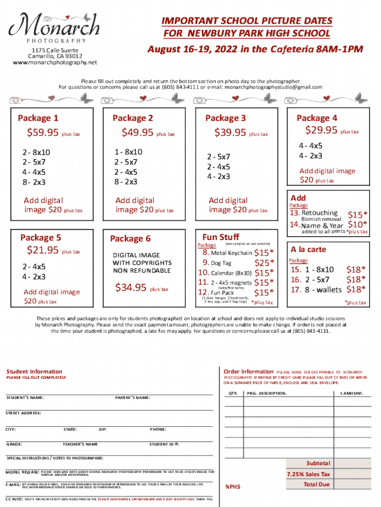 IMPORTANT SCHOOL PICTURE DATES FOR NEWBURY PARK HIGH SCHOOLPHOTOGRAPHYAugust 16191 2022 in the Cafeteria BAM1PM1175 Called Sue rte Camarillo, CA 93012 www.monarchphotography.netPl ease fill out completely