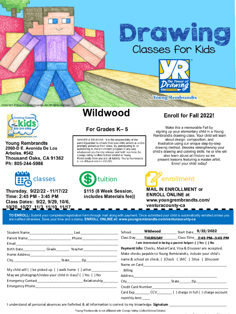 Classes Thursday, 9/22/22 11/17/22 Time: 2:45 PM 3:45 PM Class Dates: 9/22, 9/29, 10/6, 10/20, 10/27, 11/3, 11/10. 11/17enrollmenttuition $115 (8 Week Session, includes Materials fee))MAIL IN ENROLLMENT