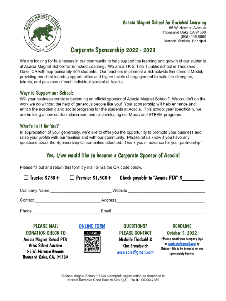 Acacia Magnet School for Enriched Learning 55 W. Norman Avenue Thousand Oaks CA 91360 (805) 4955550 Bennett Suttee, PrincipalCorporate Sponsorship 2022 2023 We are looking for businesses in our community