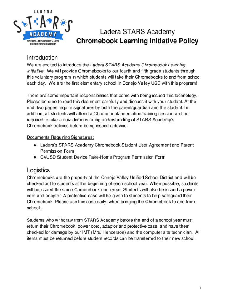 Get the free Ladera STARS Academy Chromebook Learning Initiative Policy