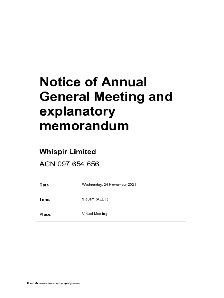 Notice of Annual General Meeting and explanatory memorandum Whisper Limited ACN 097 654 656 Date:Wednesday, 24 November 2021Time:9.30am (ADT)Place:Virtual MeetingError! Unknown document property name.