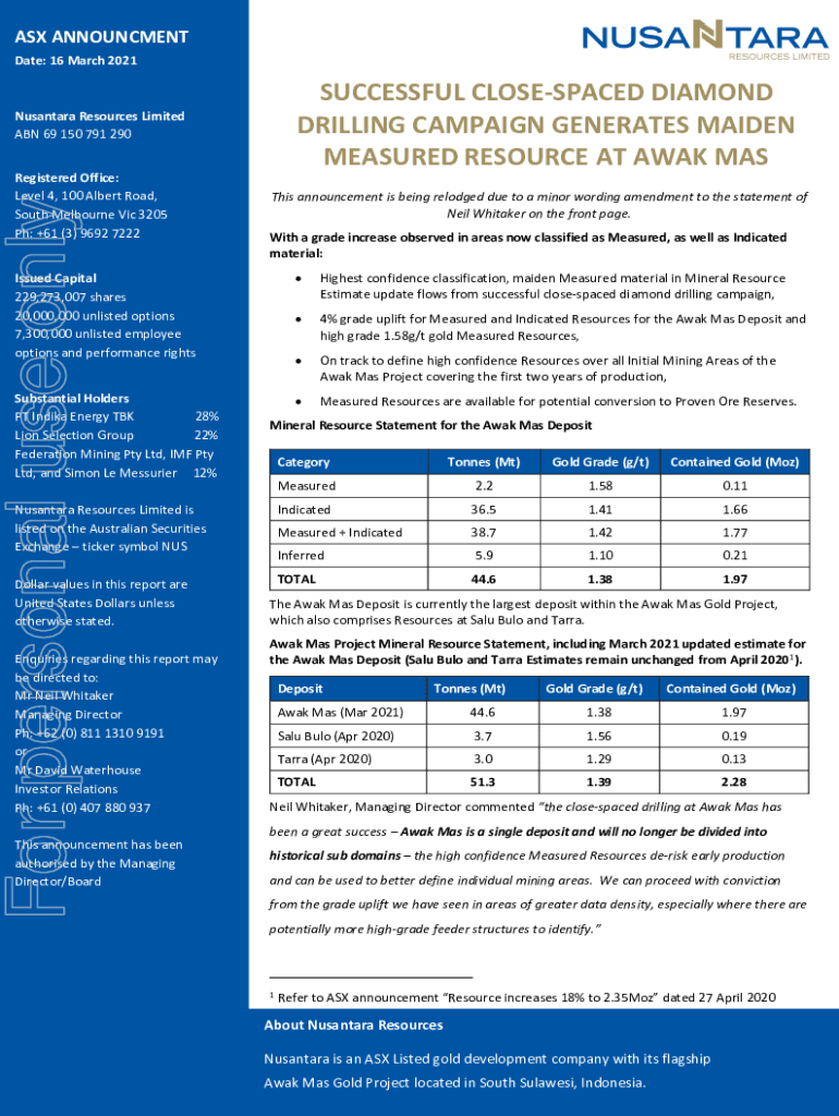 ASX ANNOUNCEMENT Date: 16 March 2021SUCCESSFUL CLOSESPACED DIAMOND DRILLING CAMPAIGN GENERATES MAIDEN MEASURED RESOURCE AT AWAY MASNusantara Resources Limited ABN 69 150 791 290For personal use unregistered