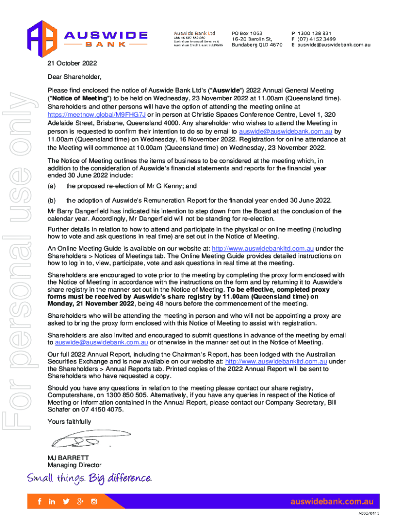 21 October 2022For personal use older Shareholder, Please find enclosed the notice of Aside Bank Ltd's (Aside) 2022 Annual General Meeting (Notice of Meeting) to be held on Wednesday, 23 November