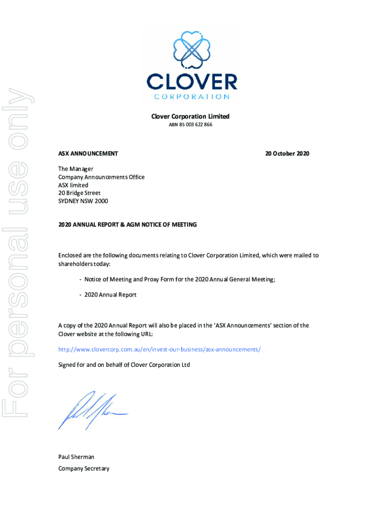 For personal use onlyCloverCorporationLimited ABN85003622866ASXANNOUNCEMENT20October2020 Manager CompanyAnnouncementsOffice ASX limited 20BridgeStreet SYDNEYNSW2000 2020ANNUALREPORT&AGMNOTICEOFMEETING