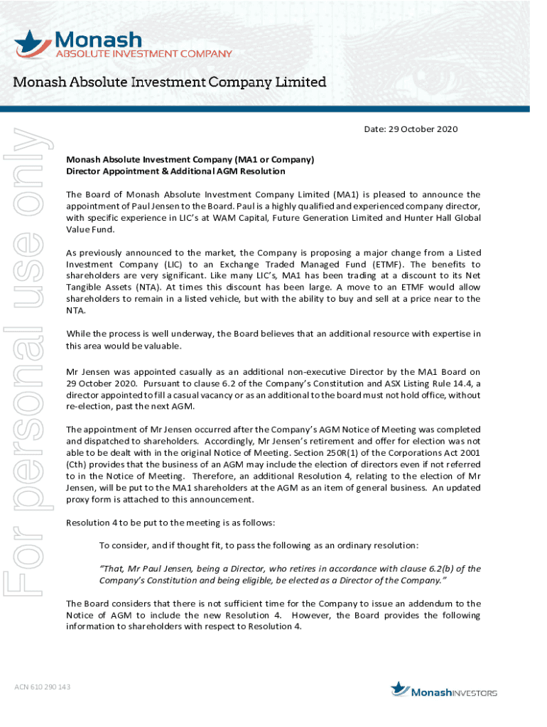 For personal use validate: 29 October 2020 Monash Absolute Investment Company (MA1 or Company) Director Appointment & Additional AGM Resolution The Board of Monash Absolute Investment Company Limited