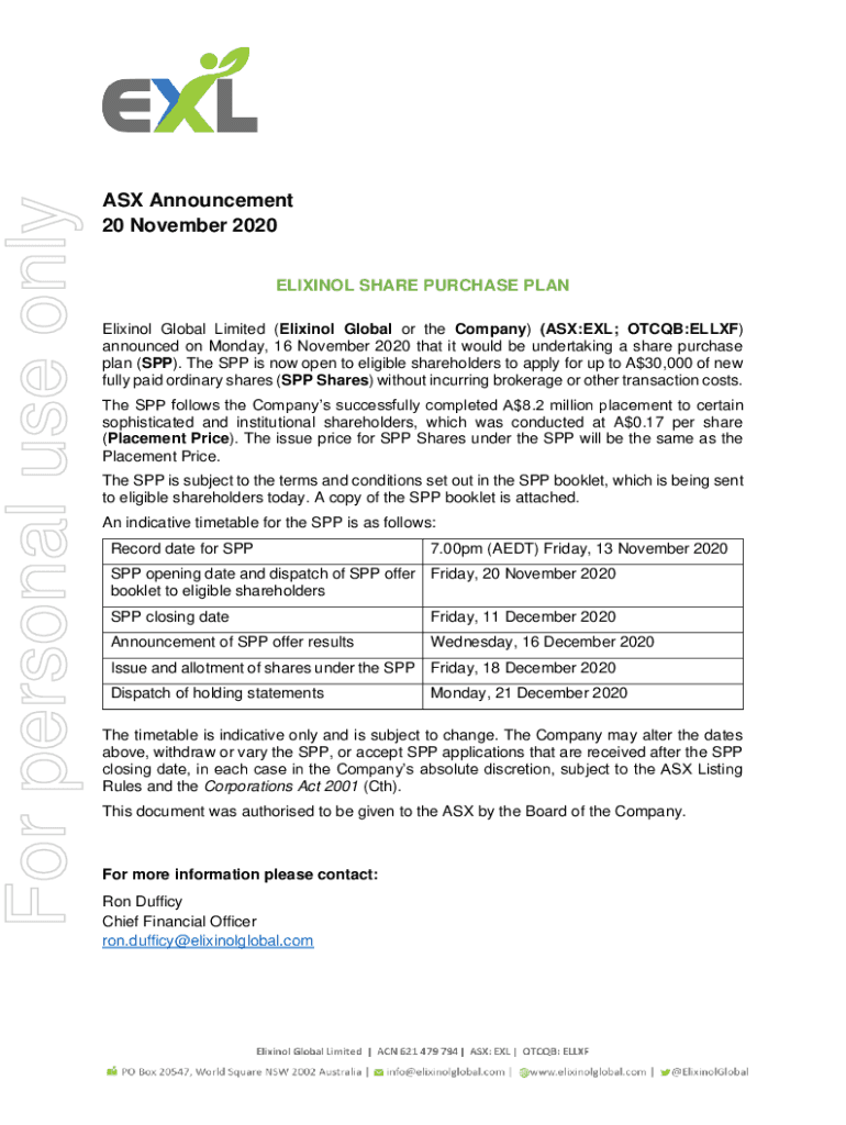 For personal use only ASX Announcement 20 November 2020 ELIXIR SHARE PURCHASE PLAN Elixir Global Limited (Elixir Global or the Company) (ASX:EX; OTC QB:ELLEN) announced on Monday, 16 November 2020