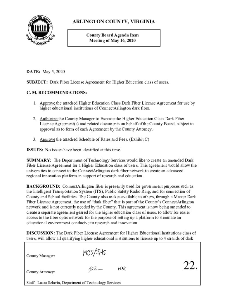ARLINGTON COUNTY, VIRGINIA Non-County Board Agenda Item Meeting of May 16, 2020DATE: May 5, 2020, SUBJECT: Dark Fiber License Agreement for Higher Education class of users. C. M. RECOMMENDATIONS: