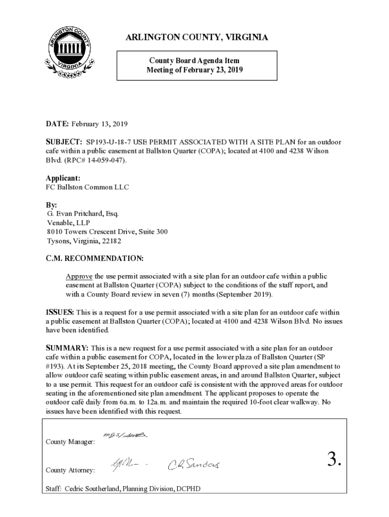 ARLINGTON COUNTY, VIRGINIA County Board Agenda Item Meeting of February 23, 2019DATE: February 13, 2019, SUBJECT: SP193U187 USE PERMIT ASSOCIATED WITH A SITE PLAN for an outdoor café within a public