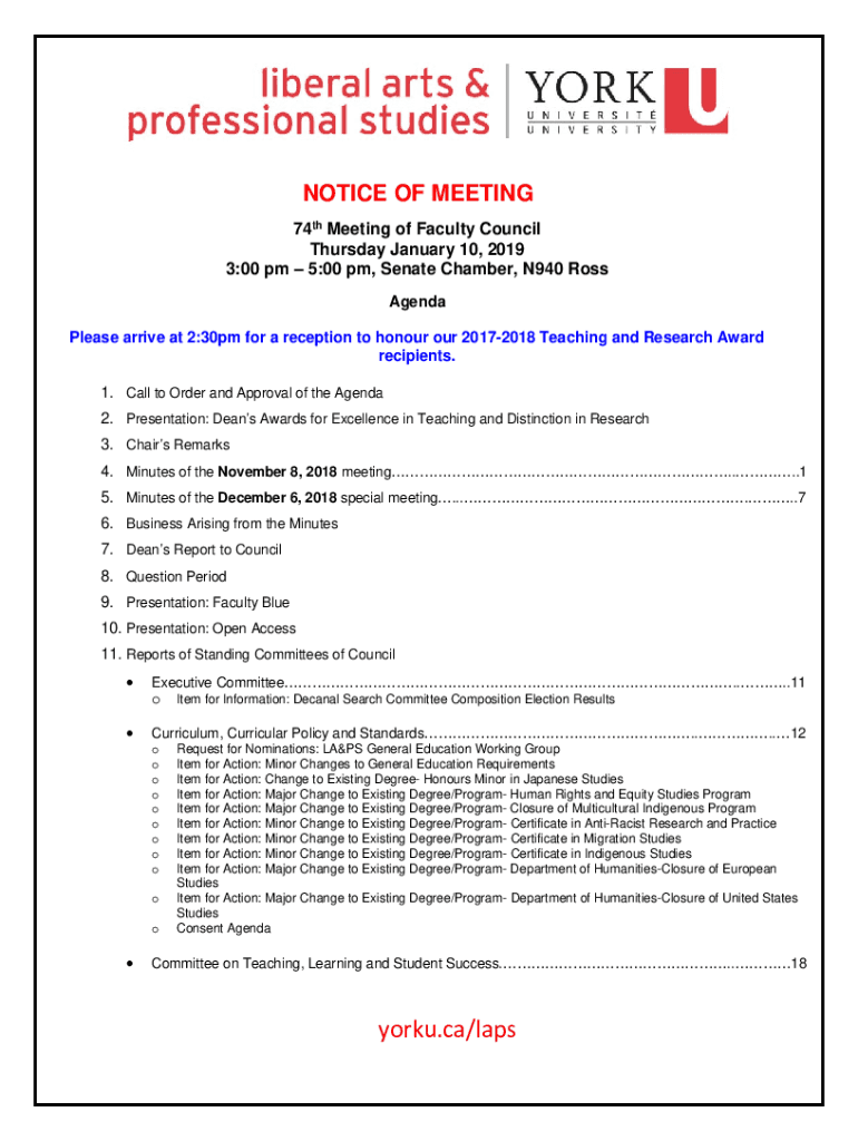 NOTICE OF MEETING 74th Meeting of Faculty Council Thursday, January 10, 2019 3:00 pm 5:00 pm, Senate Chamber, N940 Ross Agenda Please arrive at 2:30pm for a reception to honor our 20172018 Teaching