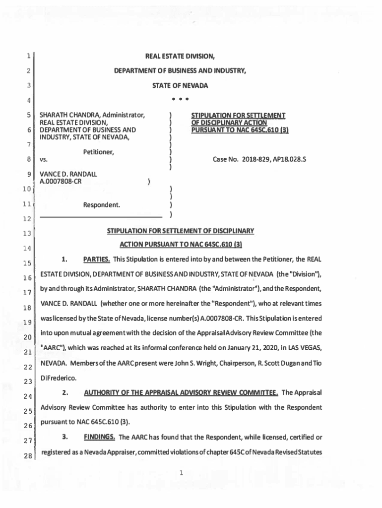 1REAL ESTATE DIVISION,2DEPARTMENT OF BUSINESS AND INDUSTRY,3STATE OF NEVADA4 5 6 7SHARATH CHANDRA, Administrator, REAL ESTATE DIVISION, DEPARTMENT OF BUSINESS AND INDUSTRY, STATE OF NEVADA, Petitioner,8vs.9VANCE