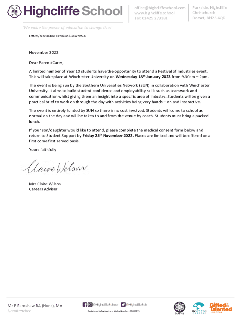 Office@highcliffeschool.com www.highcliffe.school Tel: 01425 273381Parkside, Nightlife Christchurch Dorset, BH23 4QDWe value the power of education to change lives Letters/Year10SUNFestivalJan23/CAN/SEK