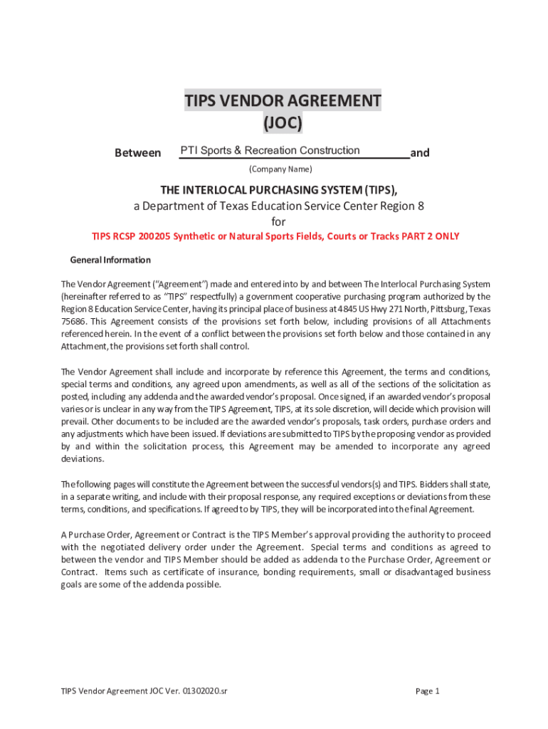 TIPS VENDOR AGREEMENT (JOC) Between PTI Sports & Recreation Construction and(Company Name)THE INTERLOCK PURCHASING SYSTEM (TIPS), a Department of Texas Education Service Center Region 8 for TIPS RCMP