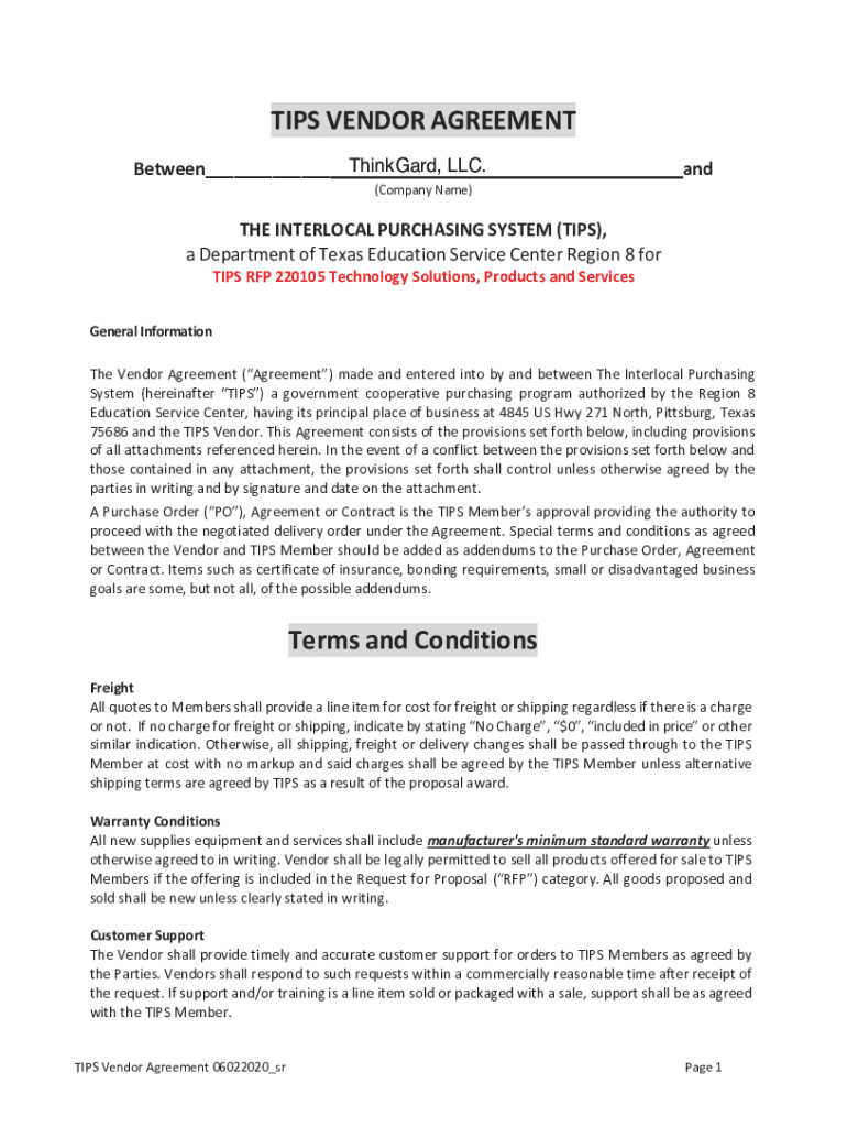 TIPS VENDOR AGREEMENT Between___ ThinkPad, LLC.and(Company Name)THE INTERLOCK PURCHASING SYSTEM (TIPS), a Department of Texas Education Service Center Region 8 for TIPS RFP 220105 Technology Solutions,