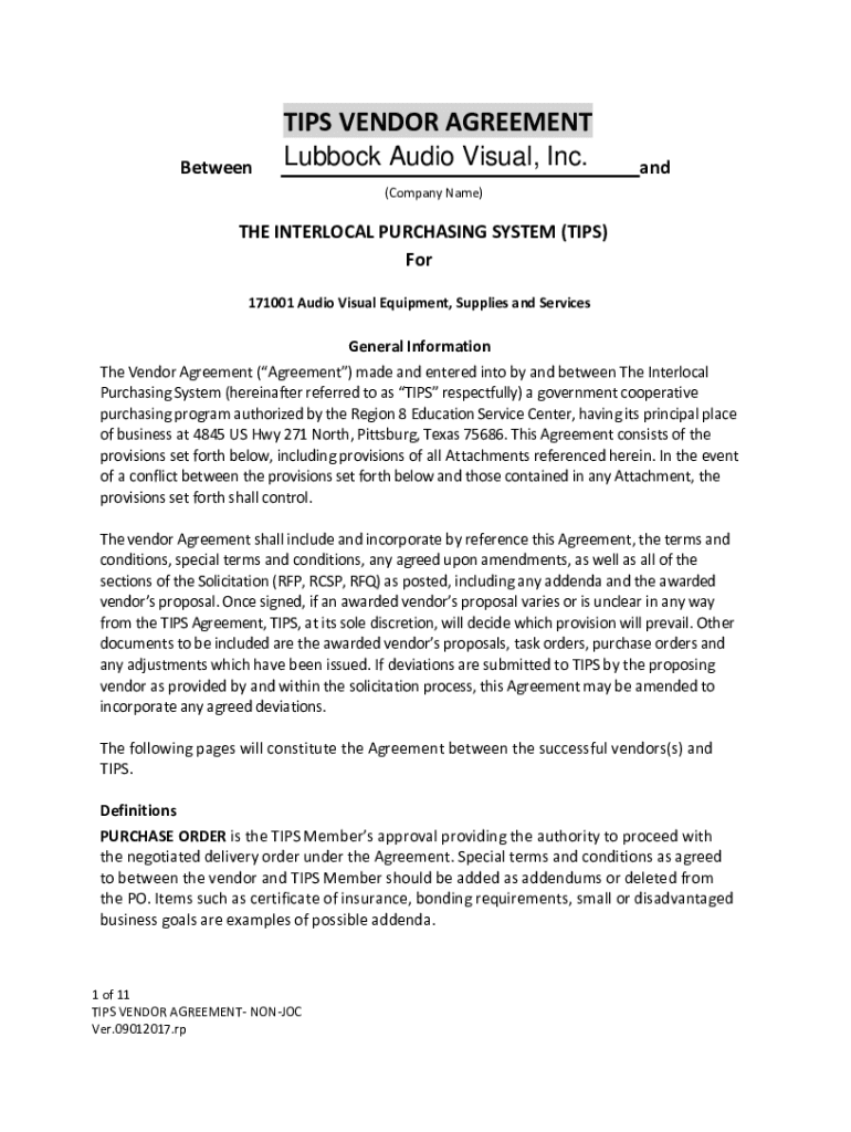 TIPS VENDOR AGREEMENT Between Lubbock Audio Visual, Inc.and(Company Name)THE INTERLOCK PURCHASING SYSTEM (TIPS) For 171001 Audio Visual Equipment, Supplies and ServicesGeneral Information The Vendor