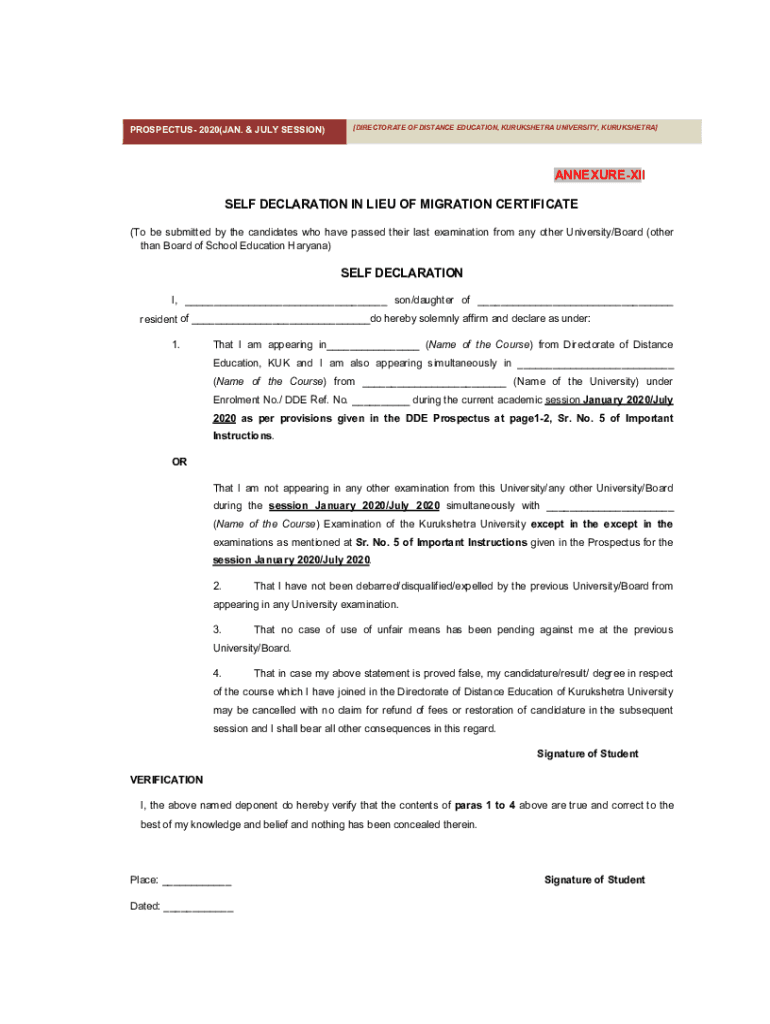 PROSPECTUS 2020(JAN. & JULY SESSION)[DIRECTORATE OF DISTANCE EDUCATION, KURUKSHETRA UNIVERSITY, KURUKSHETRA]ANNEXUREXII SELF DECLARATION IN LIEU OF MIGRATION CERTIFICATE (To be submitted by the candidates