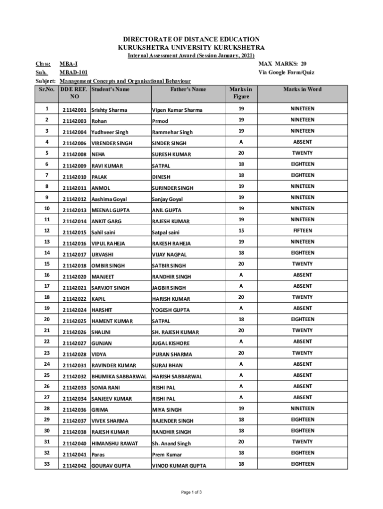 DIRECTORATE OF DISTANCE EDUCATION KURUKSHETRA UNIVERSITY KURUKSHETRA Class: Sub. Code Subject: Sr. No. Internal Assessment Award (Session January 2021) MBA MAX MARKS: 20 MBAD101 Via Google Form/Quiz