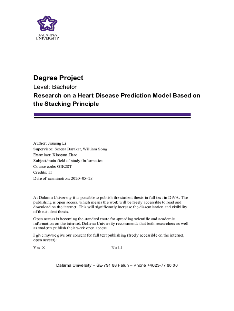 Degree Project Level: Bachelor Research on a Heart Disease Prediction Model Based on the Stacking PrincipleAuthor: Jiang Li Supervisor: Serena Arafat, William Song Examiner: Xiaoping Zhao Subject/main