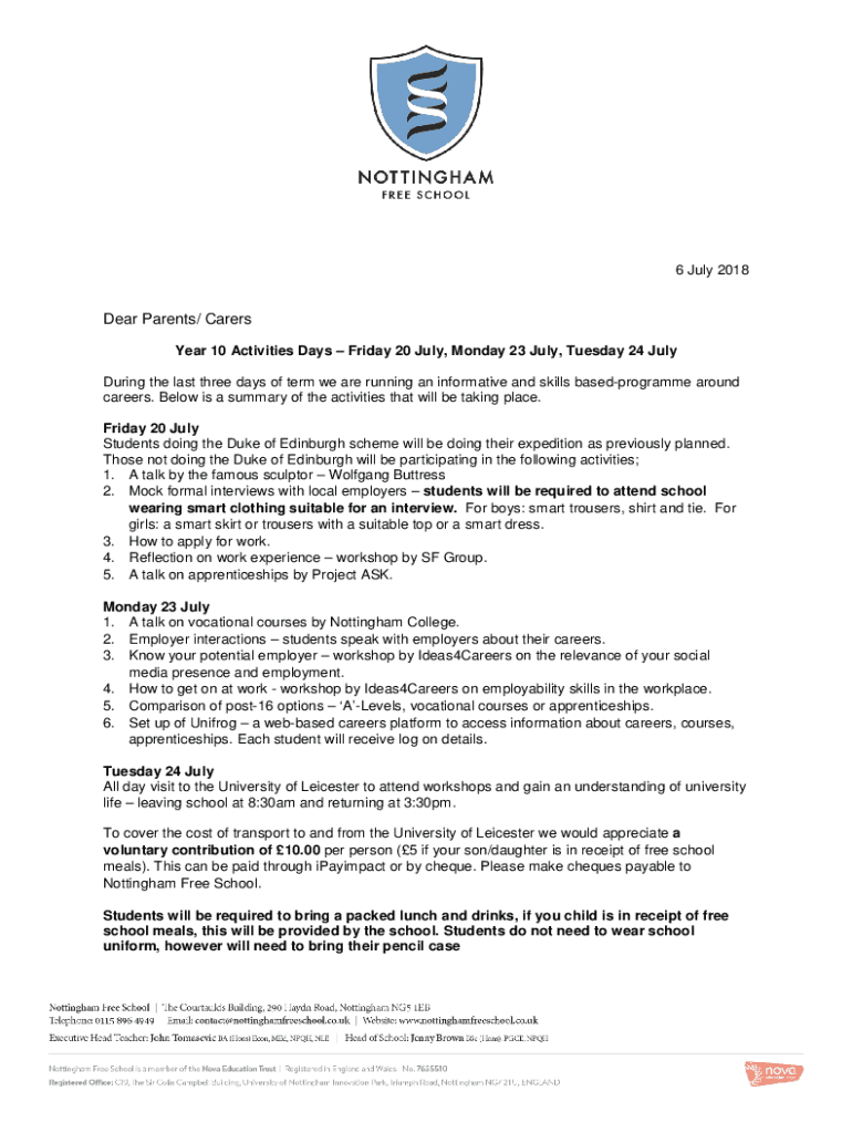 6 July 2018Dear Parents/ Carers Year 10 Activities Days Friday 20 July, Monday 23 July, Tuesday 24 July During the last three days of term we are running an informative and skills basedprogramme around