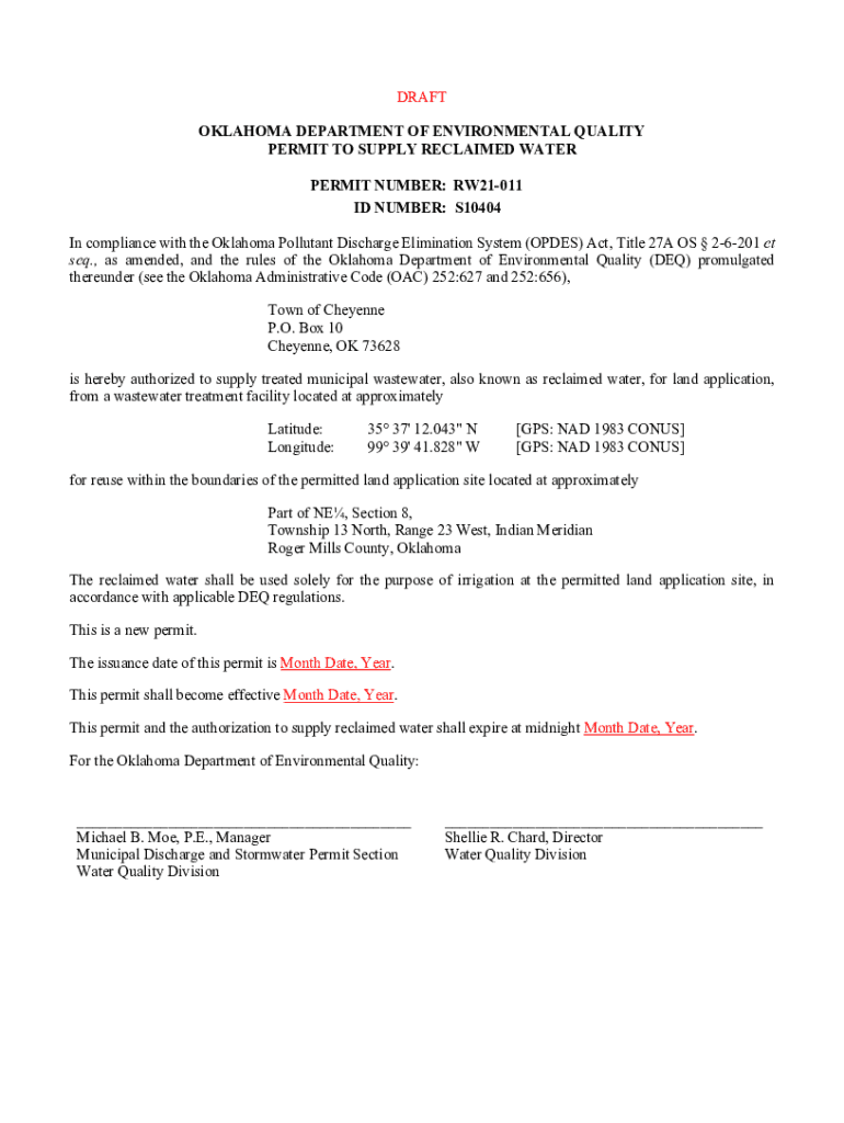 DRAFT OKLAHOMA DEPARTMENT OF ENVIRONMENTAL QUALITY PERMIT TO SUPPLY RECLAIMED WATER PERMIT NUMBER: RW21011 ID NUMBER: S10404 In compliance with the Oklahoma Pollutant Discharge Elimination System