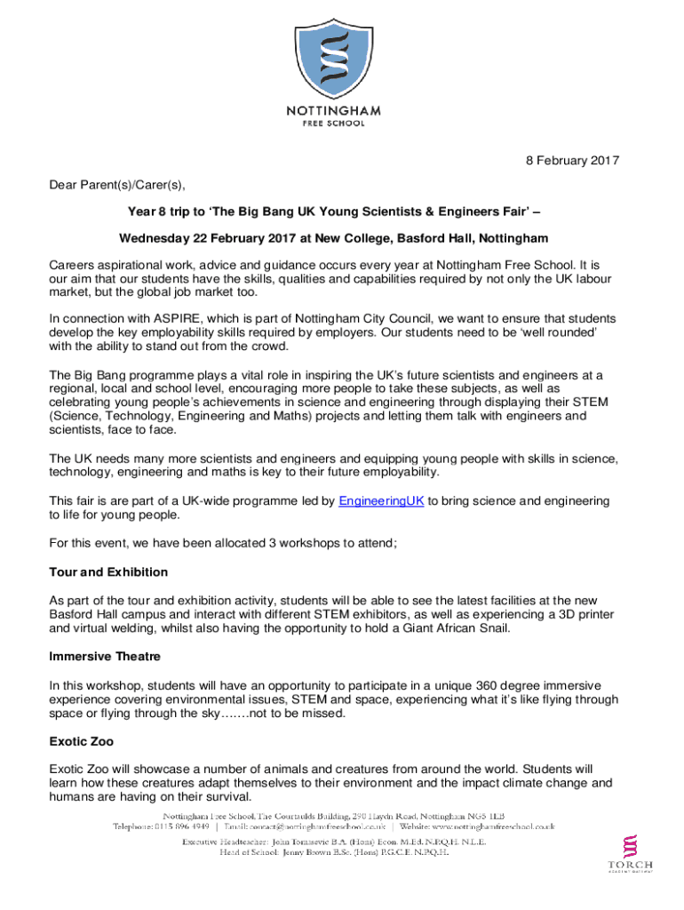 8 February 2017 Dear Parent(s)/Carer(s), Year 8 trip to The Big Bang UK Young Scientists & Engineers Fair Wednesday 22 February 2017 at New College, Basford Hall, Nottingham Careers aspirational work,
