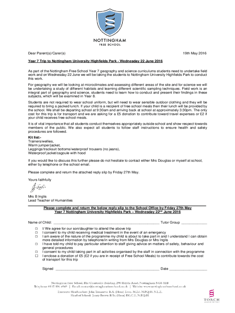 Dear Parent(s)/Carer(s)19th May 2016Year 7 Trip to Nottingham University High fields Park Wednesday 22 June 2016 As part of the Nottingham Free School Year 7 geography and science curriculums students