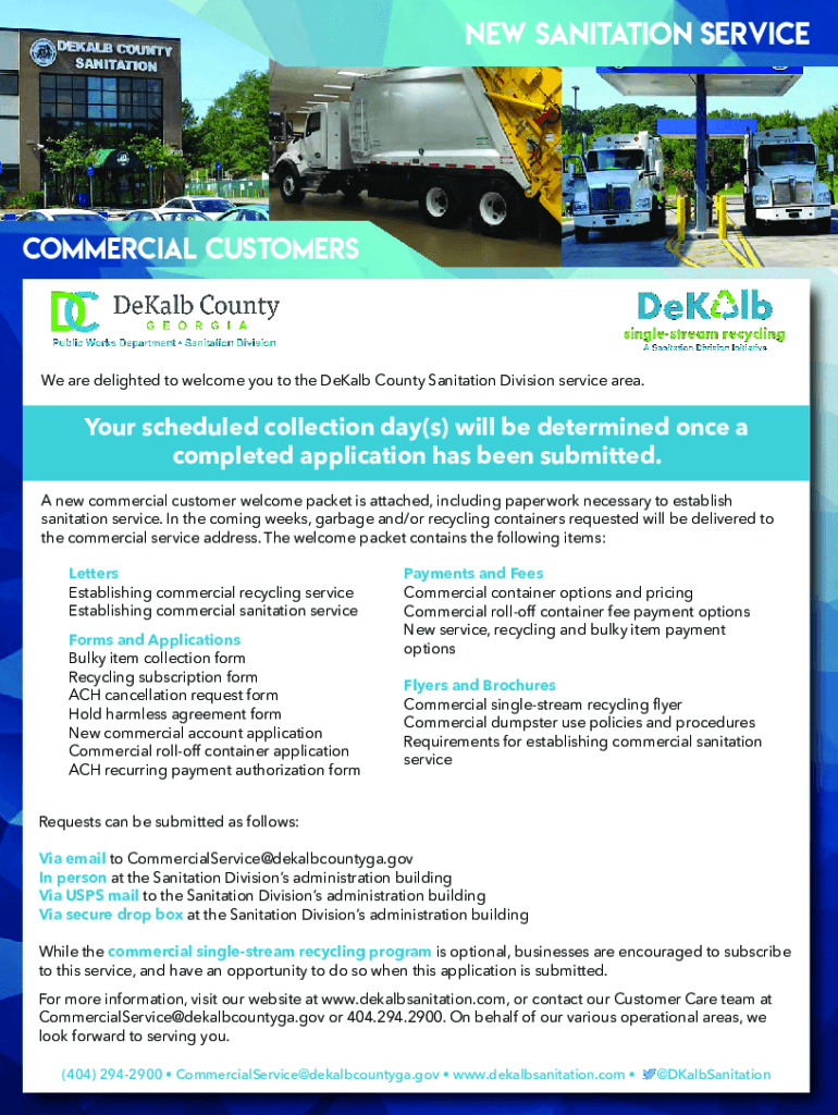 New sanitation service commercial customers are delighted to welcome you to the DeKalb County Sanitation Division service area. Your scheduled collection day(s) will be determined once a completed