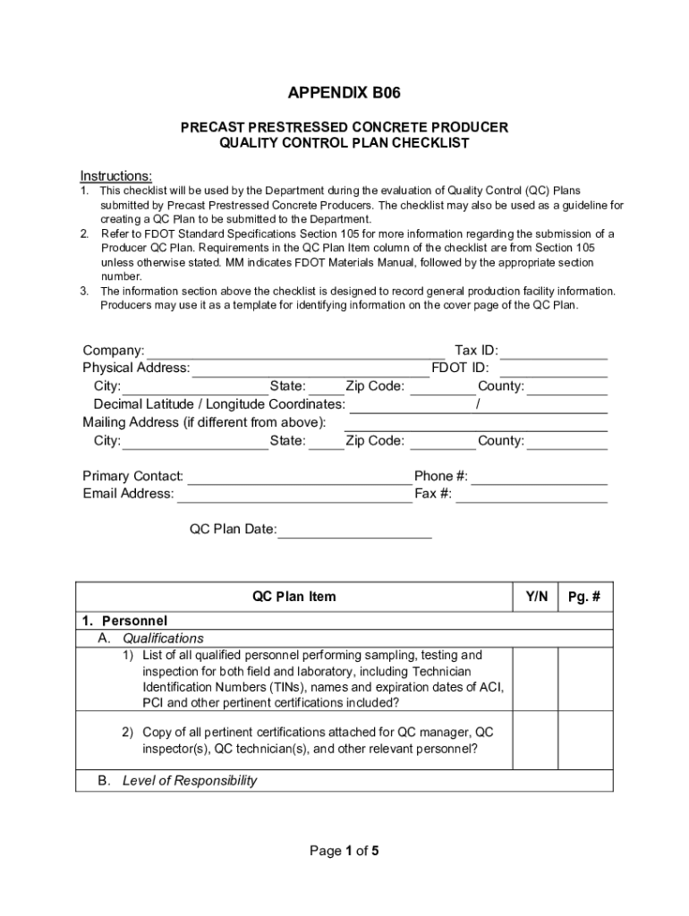 APPENDIX B06 PRECAST PRESTRESSED CONCRETE PRODUCER QUALITY CONTROL PLAN CHECKLIST Instructions: 1. This checklist will be used by the Department during the evaluation of Quality Control (QC) Plans