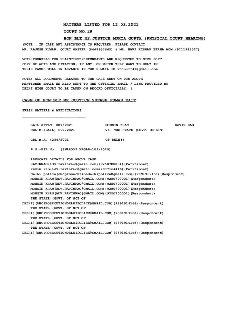 MATTERS LISTED FOR 12.03.2021 COURT NO.29 HON\'BLE MS.JUSTICE MUST GUPTA (PHYSICAL COURT HEARING) (NOTE : IN CASE ANY ASSISTANCE IS REQUIRED, PLEASE CONTACT MR. RAJESH KUMAR, COURT MASTER (8448937665)