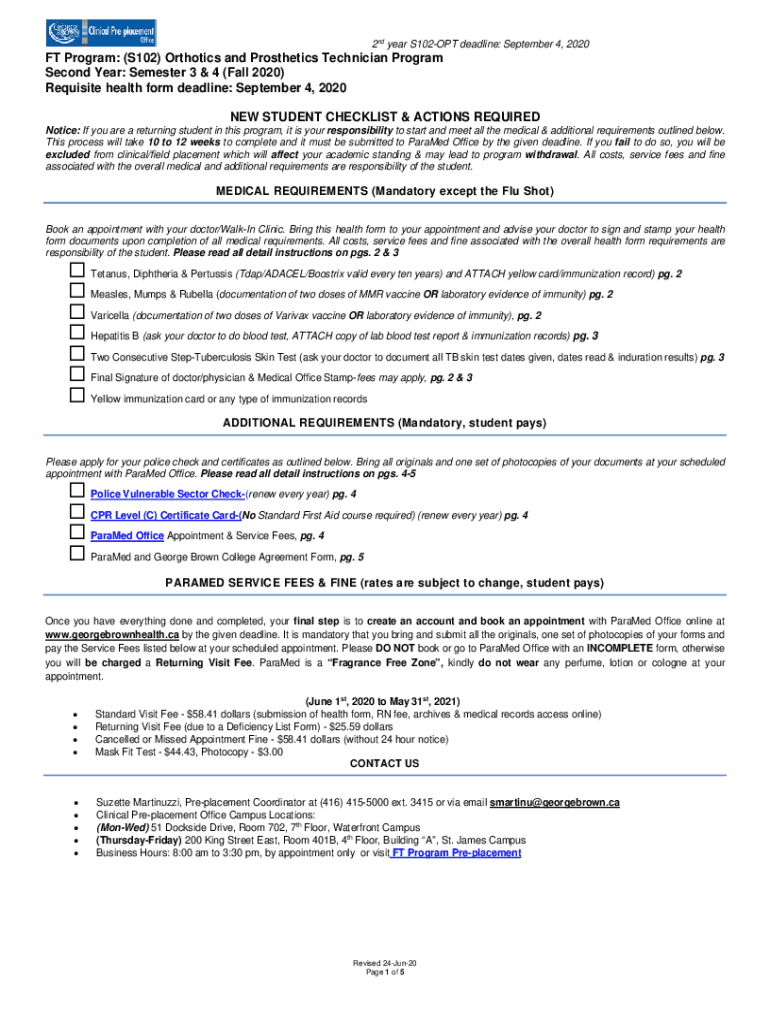 2nd year S102OPT deadline: September 4, 2020FT Program: (S102) Orthotics and Prosthetics Technician Program Second Year: Semester 3 & 4 (Fall 2020) Requisite health form deadline: September 4, 2020,