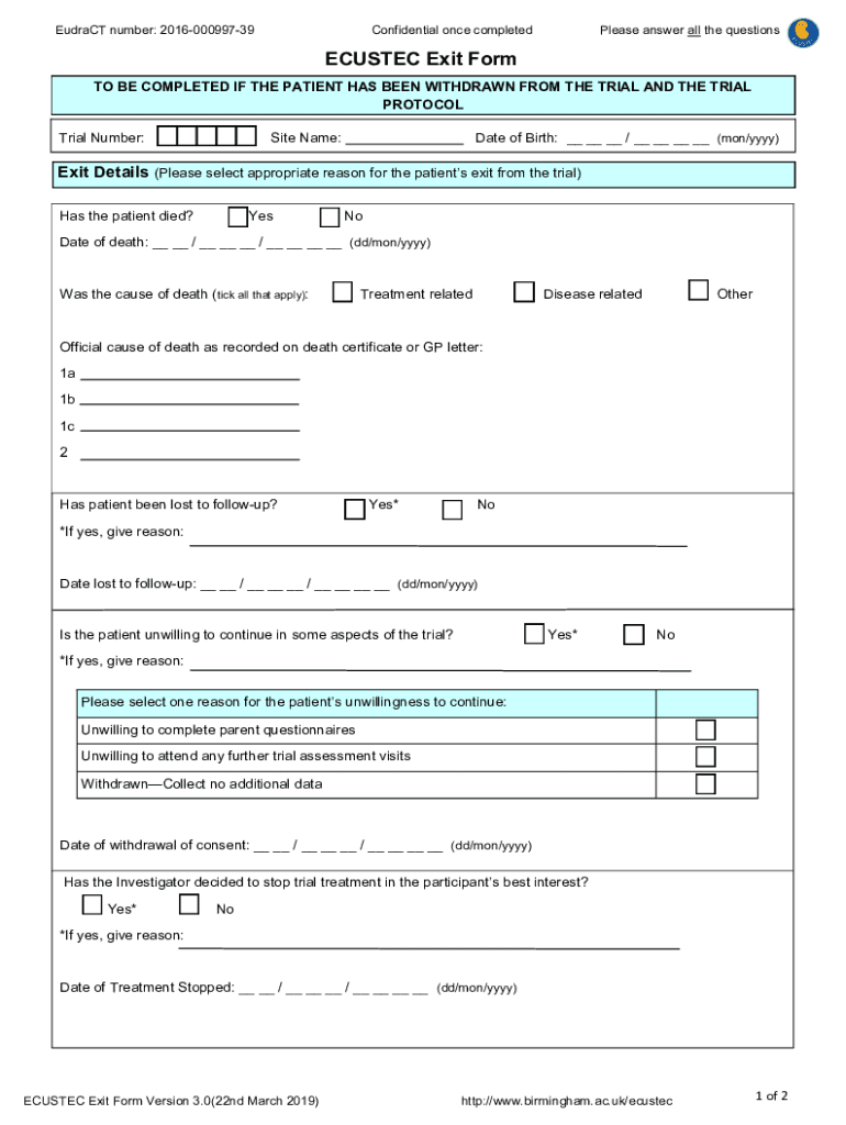 Extract number: 201600099739Confidential once completedPlease answer all the questionsECUSTEC Exit Form TO BE COMPLETED IF THE PATIENT HAS BEEN WITHDRAWN FROM THE TRIAL AND THE TRIAL PROTOCOL Trial