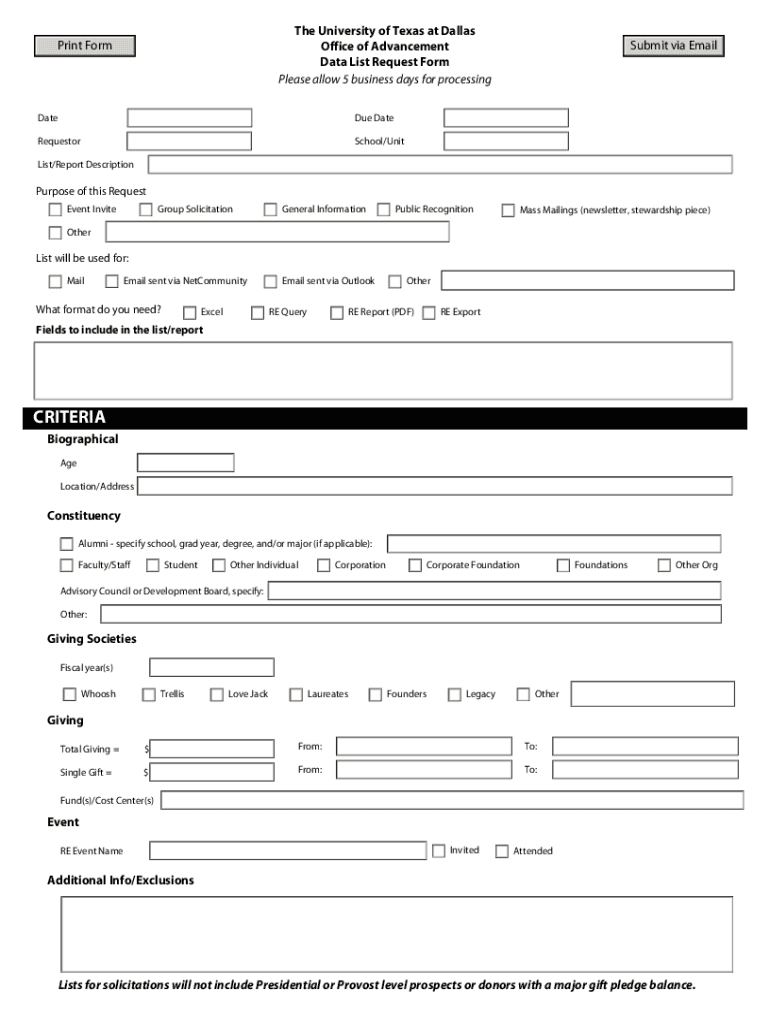 The University of Texas at Dallas Office of Advancement Data List Request Form Please allow 5 business days for processingPrint FormDateDue DateRequestorSchool/Unsubmit via Smallest/Report DescriptionPurpose