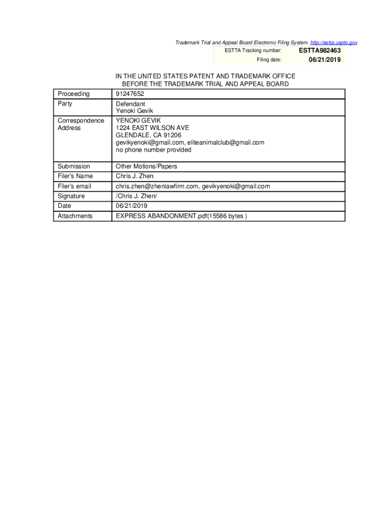 Trademark Trial and Appeal Board Electronic Filing System. http://estta.uspto.gov ETTA Tracking number: Filing date:Proceeding IN THE UNITED STATES PATENT AND TRADEMARK OFFICE BEFORE THE TRADEMARK