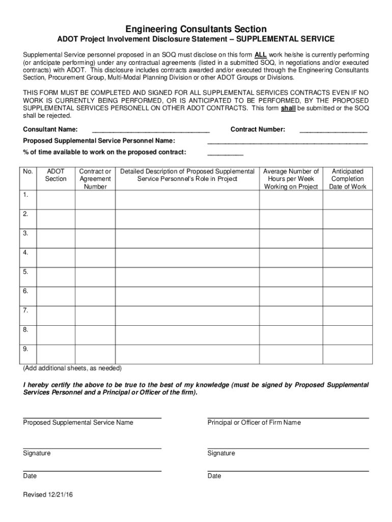 Engineering Consultants Section ADOPT Project Involvement Disclosure Statement SUPPLEMENTAL SERVICE personnel proposed in and SO must disclose on this form ALL work he/she is currently performing