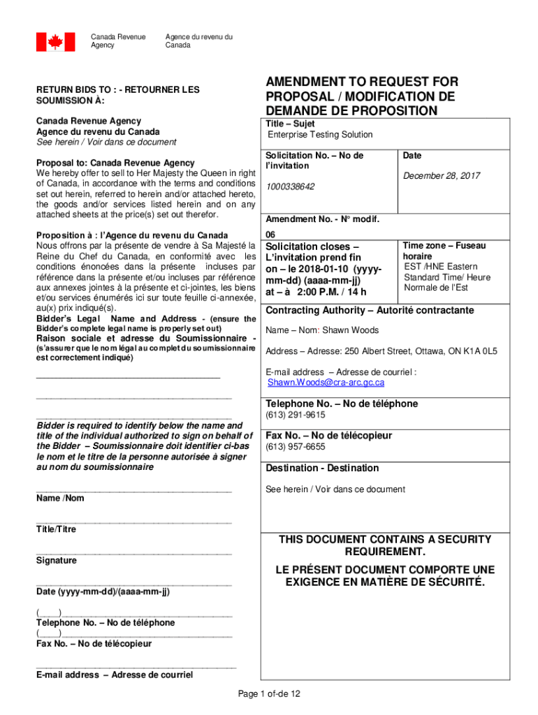 Canada Revenue AgencyAgence Du revenue Du CanadaAMENDMENT TO REQUEST FOR PROPOSAL / MODIFICATION DE DEMAND DE PROPOSITIONRETURN BIDS TO : RETURNER LES COMMISSION : Canada Revenue Agency Du revenue