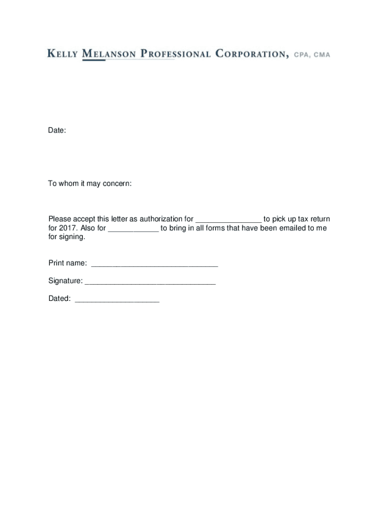 Date:To whom it may concern:Please accept this letter as authorization for ___ to pick up tax return for 2017. Also, for ___ to bring in all forms that have been emailed to me for signing. Print name: