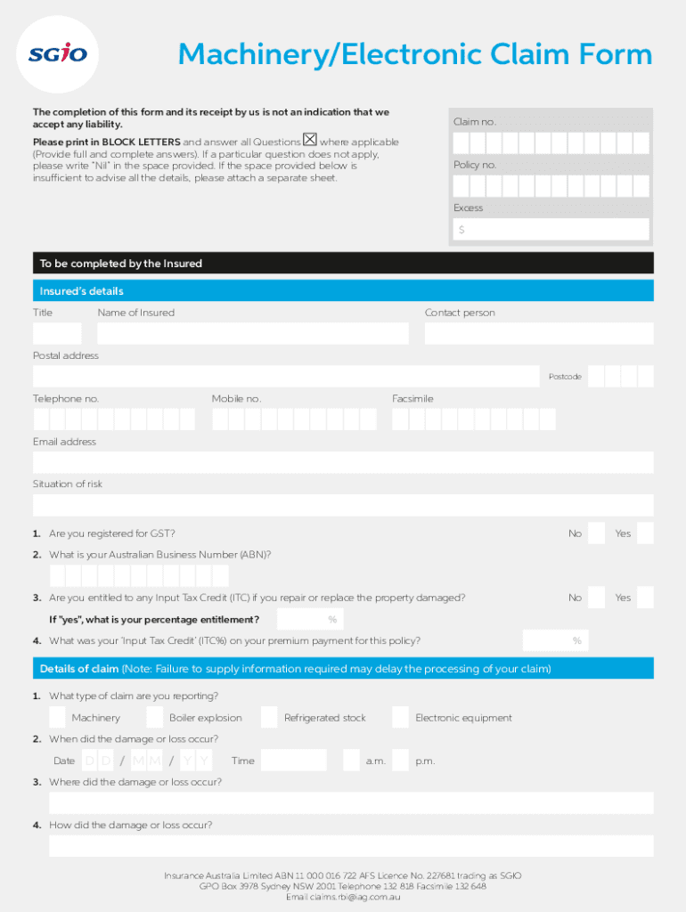 Machinery/Electronic Claim Form The completion of this form and its receipt by us is not an indication that we accept any liability. Claim no. Please print in BLOCK LETTERS and answer all Questions