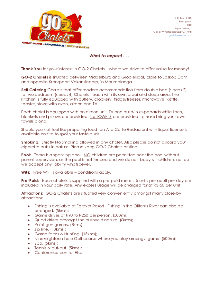 P O Box 1,000 Transport 1080 Mpumalanga Cell or WhatsApp: 082 9077947 go2@mweb.co.zaWhat to expect. . . Thank You for your interest in GO2 Chalets where we strive to offer value for money! GO2 Chalets