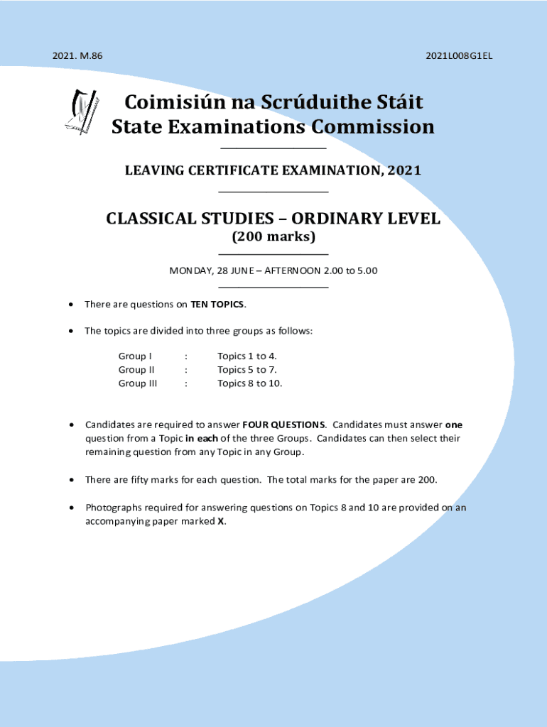 2021. M.862021L008G1ELCoimisin Na Scrduithe Stimulate Examinations Commission___LEAVING CERTIFICATE EXAMINATION, 2021___CLASSICAL STUDIES ORDINARY LEVEL(200 marks)___MONDAY,28JUNEAFTERNOON2.00to5.00
