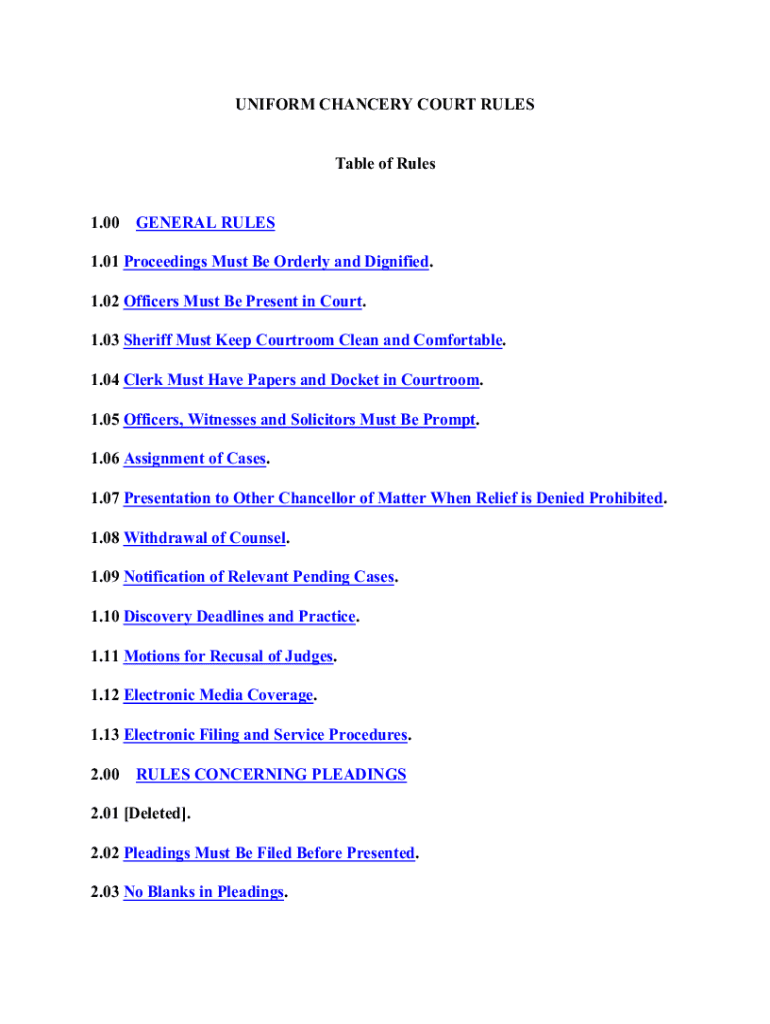 UNIFORM CHANCERY COURT Unstable of Rules1.00GENERAL RULES1.01 Proceedings Must Be Orderly and Dignified. 1.02 Officers Must Be Present in Court. 1.03 Sheriff Must Keep Courtroom Clean and Comfortable.