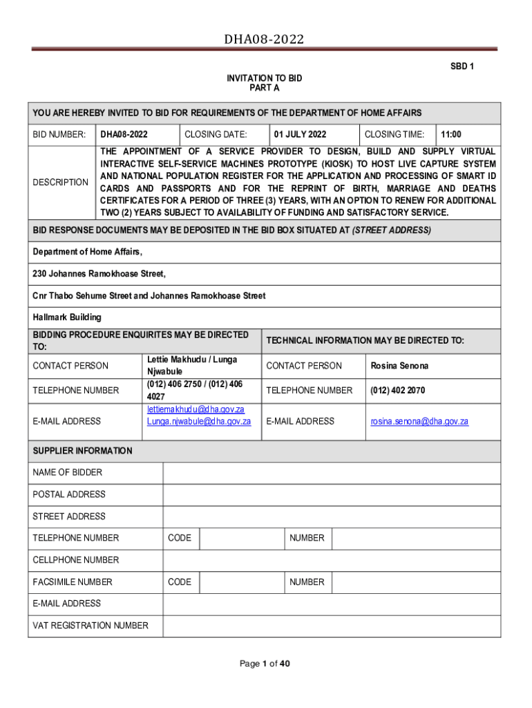 DHA082022 SBD 1 INVITATION TO BID PART A YOU ARE HEREBY INVITED TO BID FOR REQUIREMENTS OF THE DEPARTMENT OF HOME AFFAIRS BID NUMBER:DHA082022CLOSING DATE:01 JULY 2022CLOSING TIME:11:00DESCRIPTIONTHE