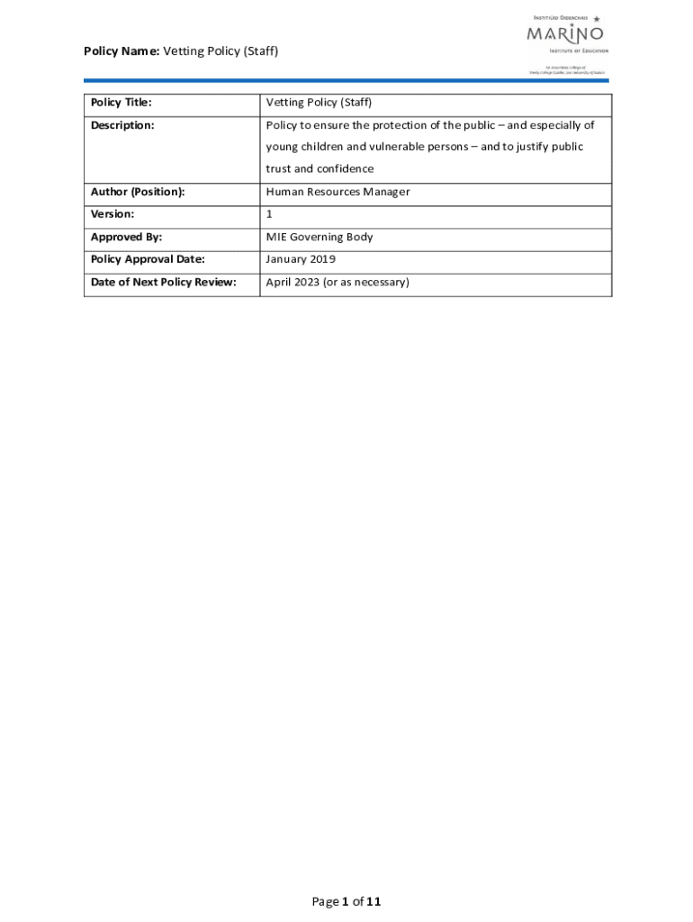 Get the free Policy Name: Vetting Policy (Staff) - Marino Institute of Education