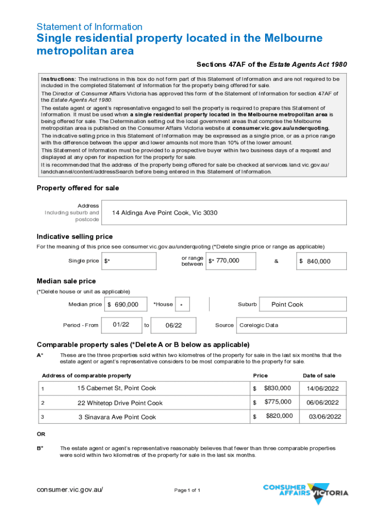 Statement of InformationSingle residential property located in the Melbourne metropolitan area Sections 47AF of the Estate Agents Act 1980 Instructions: The instructions in this box do not form part