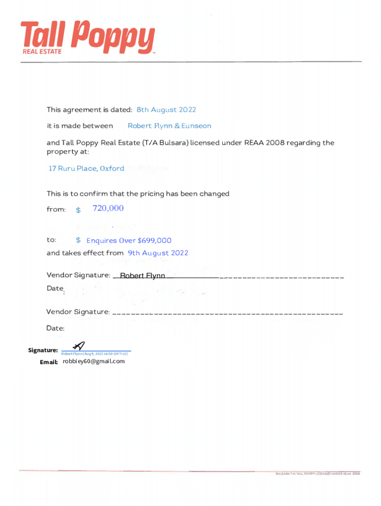 OQLF Poppy This agreement is dated: 8th August 2022 it is made between Robert Flynn & Eunseonand Tall Poppy Real Estate (T/A Bulgaria) licensed under REAL 2008 regarding the property at: 17 Guru Place,