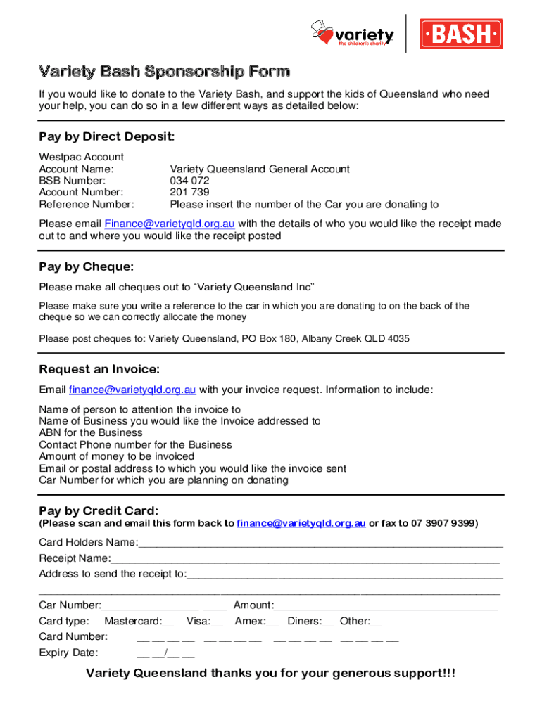 Variety Bash Sponsorship Form If you would like to donate to the Variety Bash, and support the kids of Queensland who need your help, you can do so in a few different ways as detailed below:Pay by