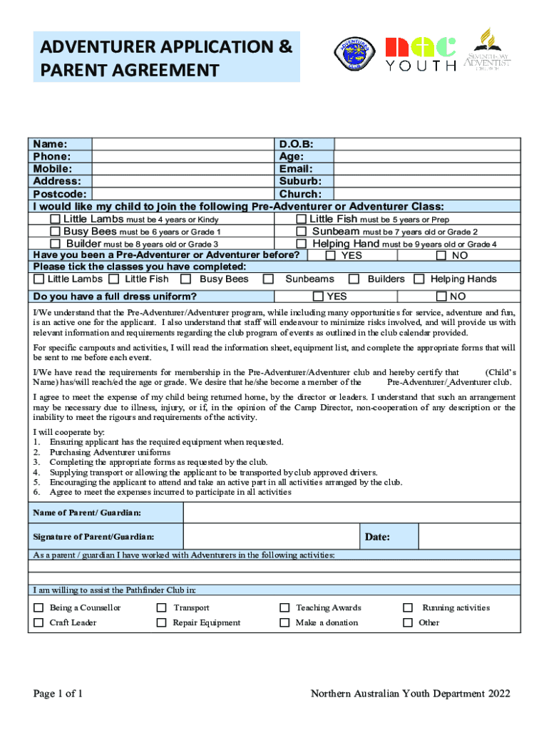 Get the free Online ADVENTURER APPLICATION & PARENT AGREEMENT Fax ...